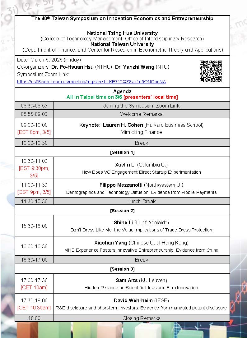 Director Po-Hsuan Hsu (NTHU) and Dr. Yanzhi Wang (NTU) hosted the 40th Taiwan Symposium on Innovation Economics and Entrepreneurship virtually on Friday, March 6, 2026.
